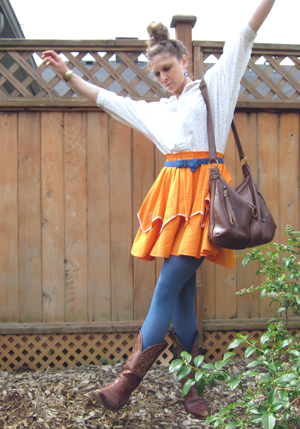 | Vintage shirt, skirt, and boots; Hue tights; bag from 3 Monkeys; earrings by my friend, Emily |